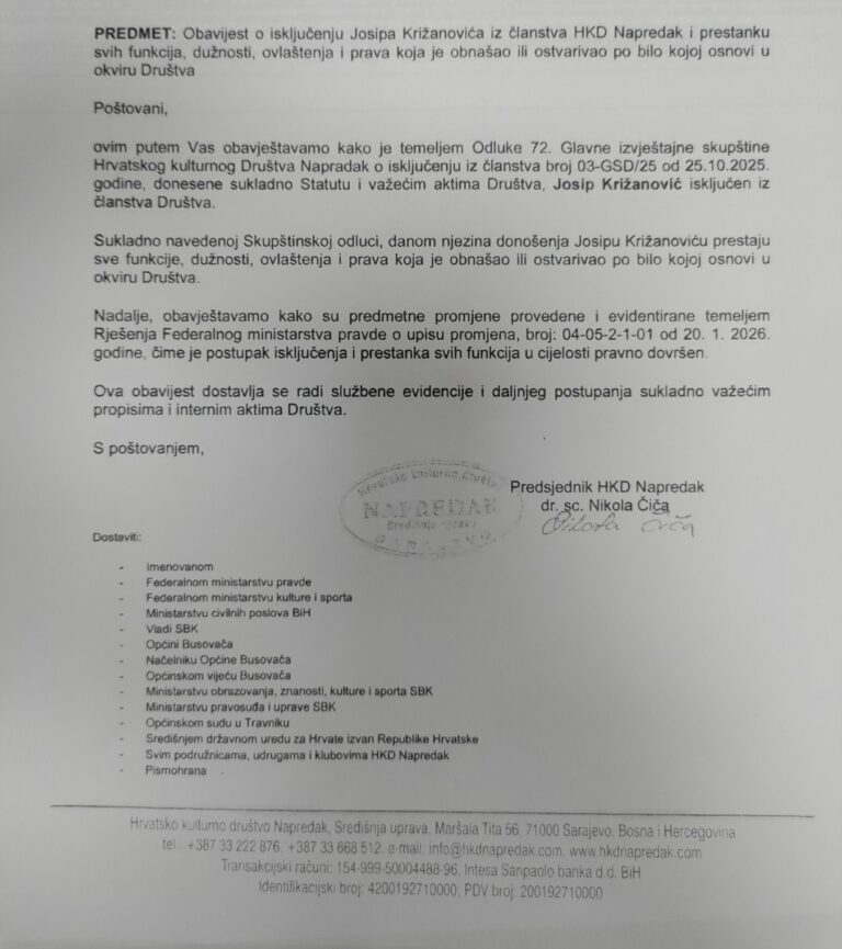 Dopis Središnje uprave Hrvatskog kulturnog društva Napredak Sarajevo o isključenju iz članstva, koji je dostavljen institucijama prenosimo u cijelosti: