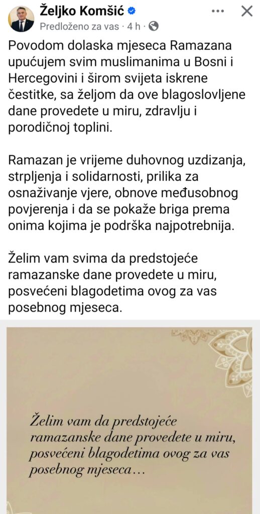 Istog dana započela je i Korizma, razdoblje posta i duhovne priprave pred Uskrs za katolike. Za vjernike katoličke tradicije, koja je duboko ukorijenjena u identitetu hrvatskog naroda u Bosni i Hercegovini, početak Korizme ima snažnu religijsku i kulturnu simboliku. Ipak, iz Komšićeve javne komunikacije nije bilo poruke povodom tog važnog trenutka.