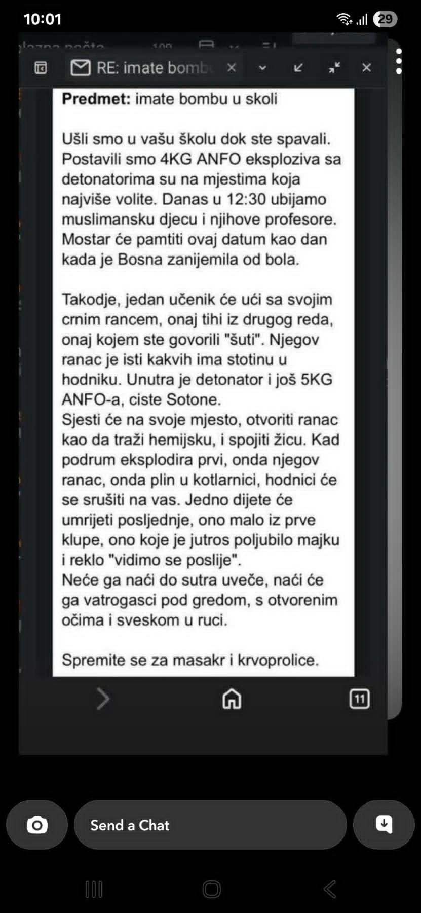 U poruci koja je stigla školama iznesene su ozbiljne prijetnje, uključujući tvrdnje o postavljenom eksplozivu i najave napada, uz dodatno opisivanje mogućeg scenarija.