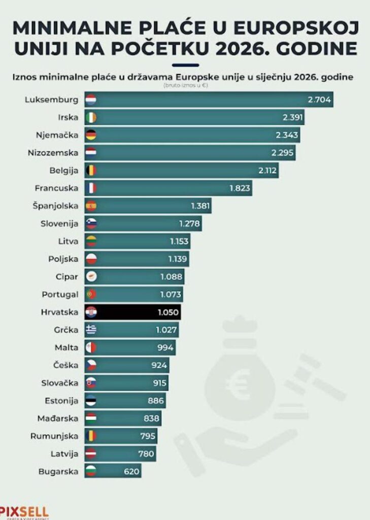 Hrvatska ima minimalnu bruto plaću od 1.050 eura, čime se svrstava u donju polovinu EU ljestvice.