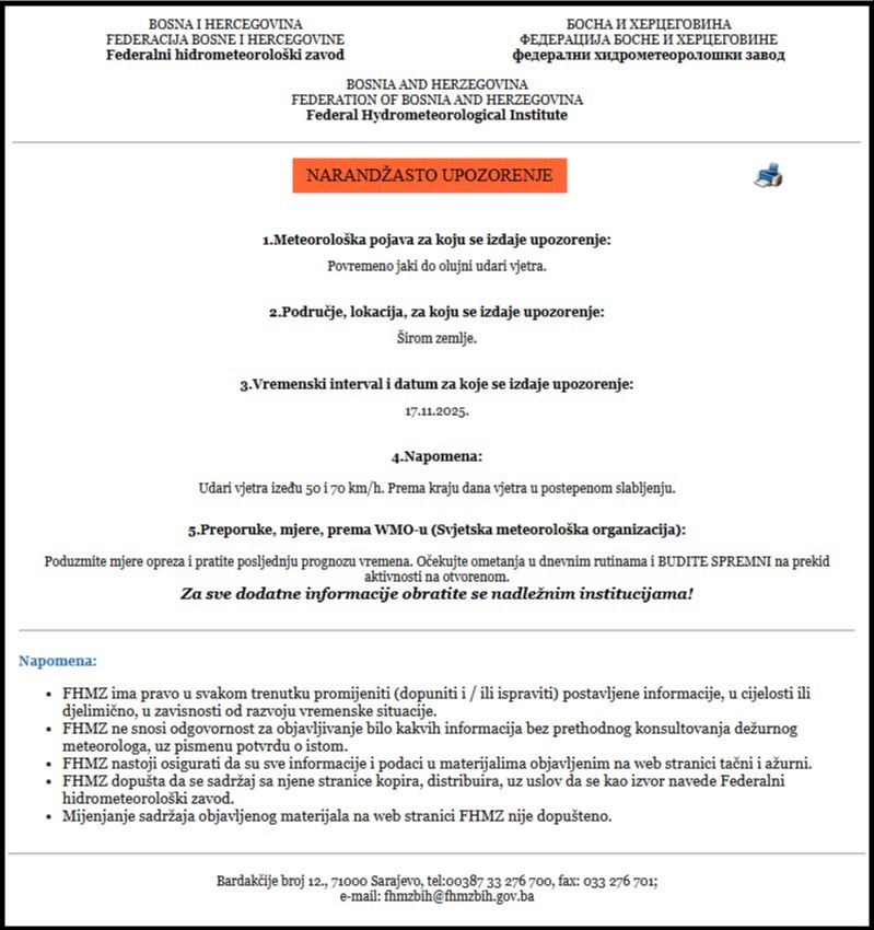 Fedralni hidrometeorološki zavod izdao je narandžasto upozorenje za danas zbog povremeno jakih do olujnih udara vjetra.