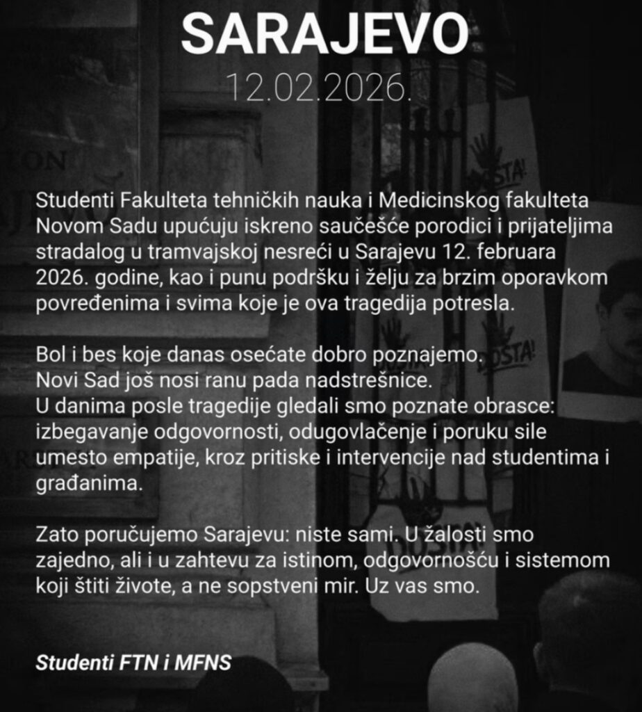 Dok Sarajevo peti dan zaredom izlazi na ulice tražeći pravdu za tešku prometnu nesreću u kojoj je poginuo mladić Erdoan Morankić (23), a teško ozlijeđena 17-godišnja Ella Jovanović, podrška stiže iz Novog Sada. Studenti Fakulteta tehničkih znanosti (FTN) i Medicinskog fakulteta (MFNS) poručili su građanima Sarajeva da su ujedinjeni u traženju odgovornosti, povlačeći paralelu s tragedijom koja je zadesila njihov grad.