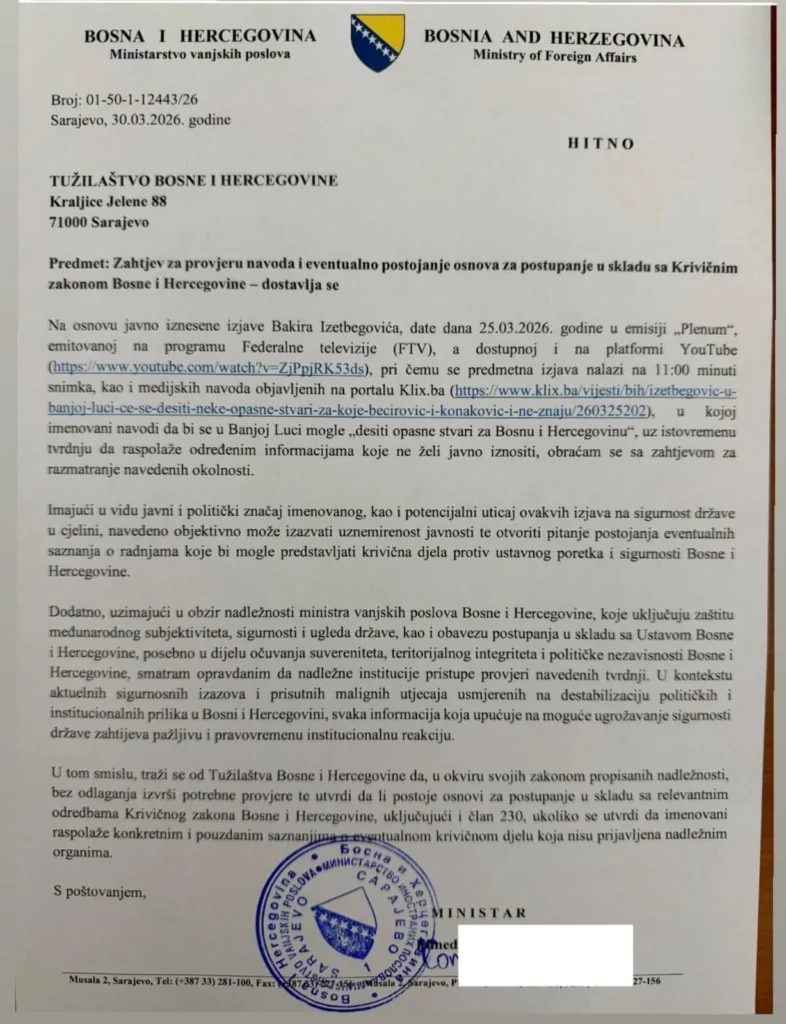 Šef bosanskohercegovačke diplomacije Elmedin Konaković podnio je kaznenu prijavu protiv lidera SDA Bakira Izetbegovića, doznaje portal Radiosarajevo.ba.