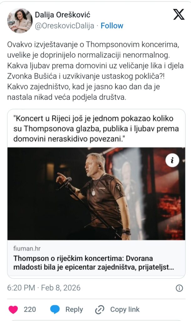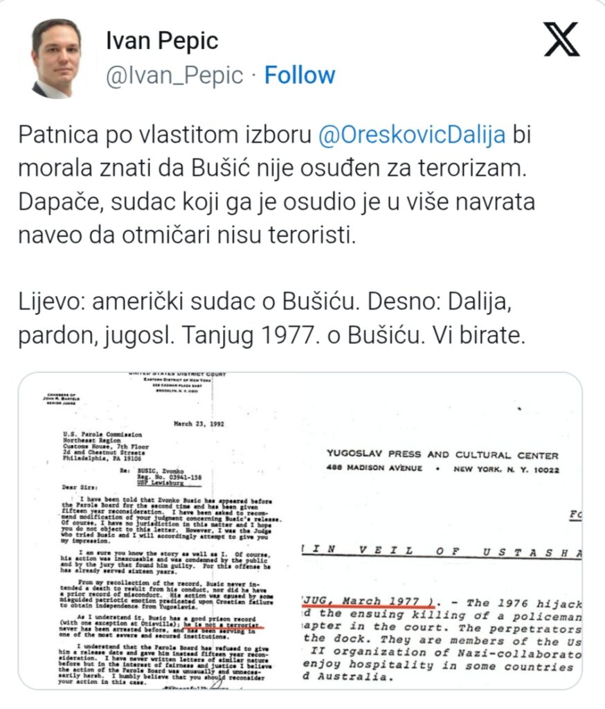 “Kakva ljubav prema domovini uz veličanje lika i djela Zvonka Bušića i uzvikivanje ustaškog pokliča?!”, napisala je Orešković na X-u. Thompson, podsjetimo, na svojim koncertima nosi majicu s brojem 03941158. Taj broj zapravo je posveta Bušiću, koji je u zatvoru bio je poznat kao zatvorenik pod tim brojem. Na objavu Dalije Orešković reagirao je politolog Ivan Pepić. On je u prilogu ostavio kopiju dokumenta na kojemu američki sudac jasno naznačuje da Bušić nije terorist.