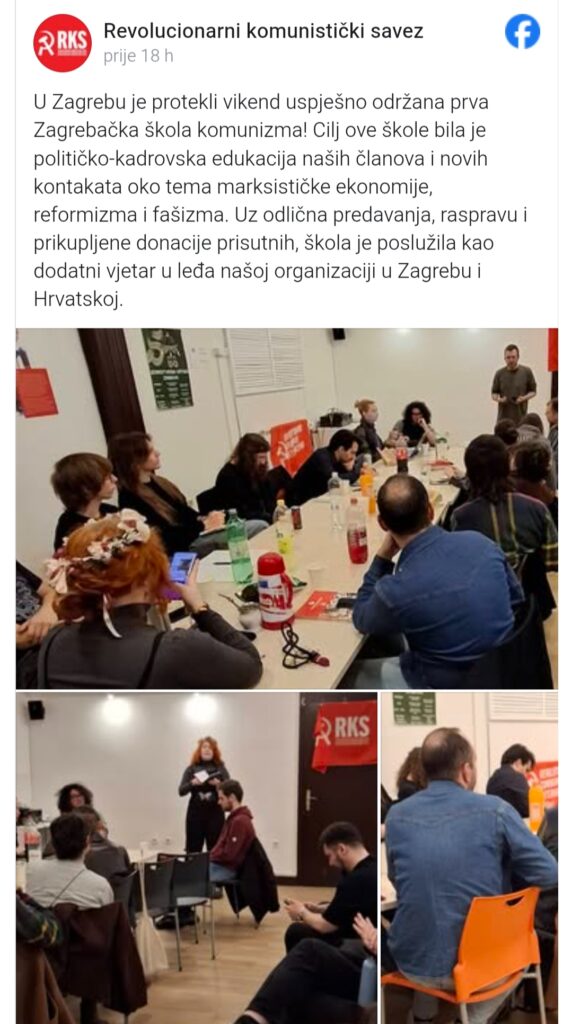 “U Zagrebu je protekli vikend uspješno održana prva Zagrebačka škola komunizma! Cilj ove škole bila je političko-kadrovska edukacija naših članova i novih kontakata oko tema marksističke ekonomije, reformizma i fašizma. Uz odlična predavanja, raspravu i prikupljene donacije prisutnih, škola je poslužila kao dodatni vjetar u leđa našoj organizaciji u Zagrebu i Hrvatskoj”, stoji u objavi na društvenim mrežama RKS-a.