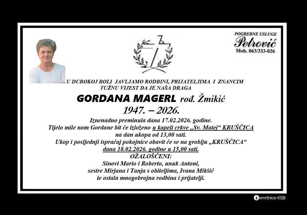S velikom tugom obavještavamo građane Viteza o smrti Gordana Magerl (1947. – 2026.), umirovljene prosvjetne djelatnice iz Viteza koja je tijekom svog dugogodišnjeg rada ostavila snažan utjecaj na brojne generacije djece i mladih.
