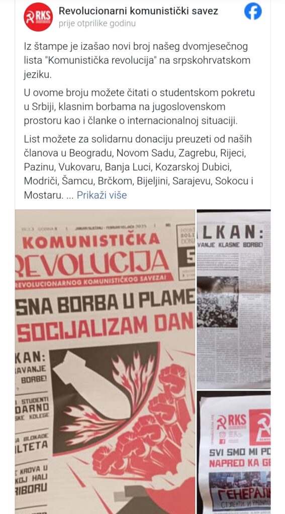 Imaju vlastito glasilo ”Komunistička revolucija” te portal ”Crvena kritika”, čiji autori često pišu anonimno i svjesno koriste tzv. ”srpsko-hrvatski ili hrvatsko-srpski” jezik. Organizacija otvoreno ističe da joj je cilj rušenje kapitalizma i izgradnja međunarodne revolucionarne komunističke partije.
