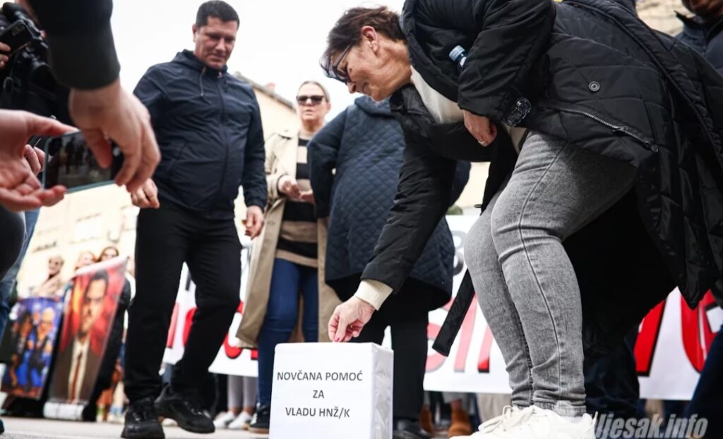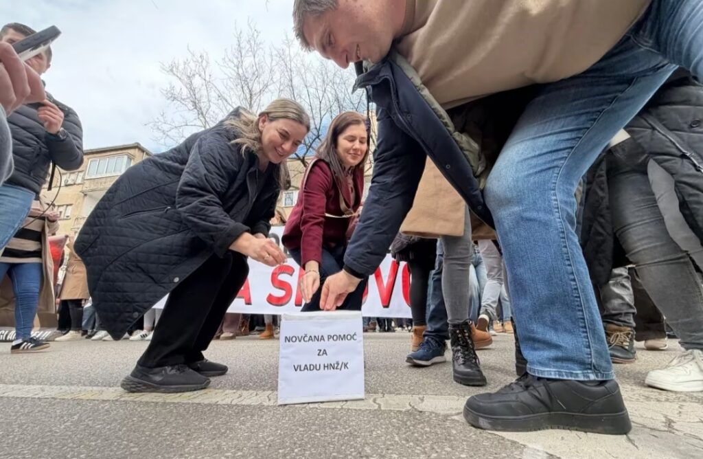 Predstavnici sindikata zdravstvenih radnika tijekom današnje prosvjede ispred zgrade Vlade Hercegovačko-neretvanske županije simbolično su postavili kartonsku kutiju za prikupljanje novčane pomoći – za samog Vladu HNŽ-a.